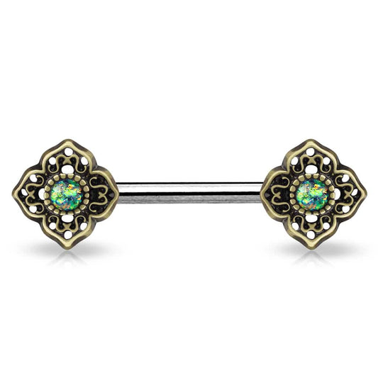 4 Point Brass Filigree + Opal Nipple Barbell 14g
